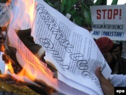 Пакистандыктар АКШ беш жыл бою 1,5 миллиард доллардан берчү жардам жөнүндөгү Керри-Лугар мыйзамынын көчүрмөсүн өрттөшүүдө. Карачи. 23-октябрь.