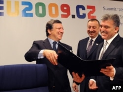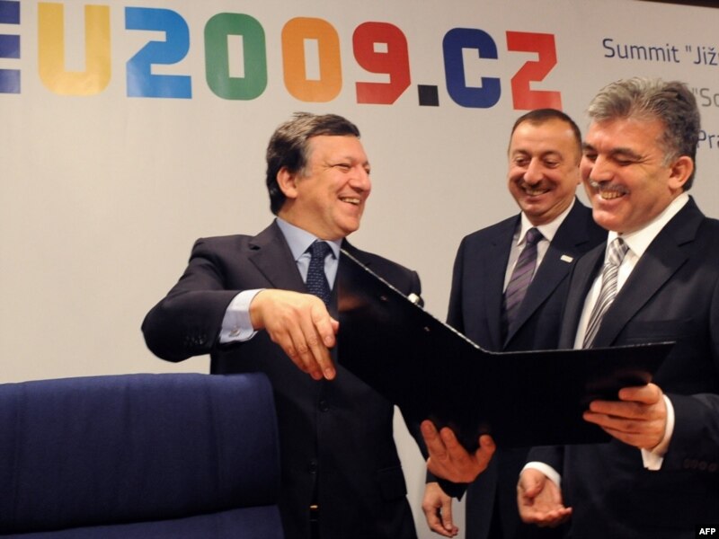 Еврокомиссиянын төрагасы Жозе Мануэл Баррозу Түркиянын президенти Абдулла Гүлгө жана Азербайжан президенти Илхам Алиевге "Набукко" боросун куруу жөнүндө кол коюлган келишимди көрсөтүүдө. Прагадагы ЕБнын газ саммити. 8-май 2009