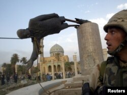 АКШлык жоокер Саддам Хусейндин кулатылган айкелине таңданып кароодо. Багдад. 9-апрель 2003