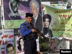 Ирак полициясынын кызматкери парламентке талапкердин плакаты алдында күзөттө. Багдад. 3-март 2010