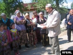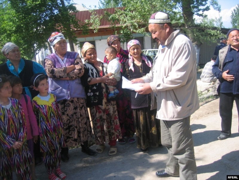 Айыл тургуну Манап Божоев президент Бакиевдин наамына жазылган кайрылууну айылдаштарына окуп берүүдө.