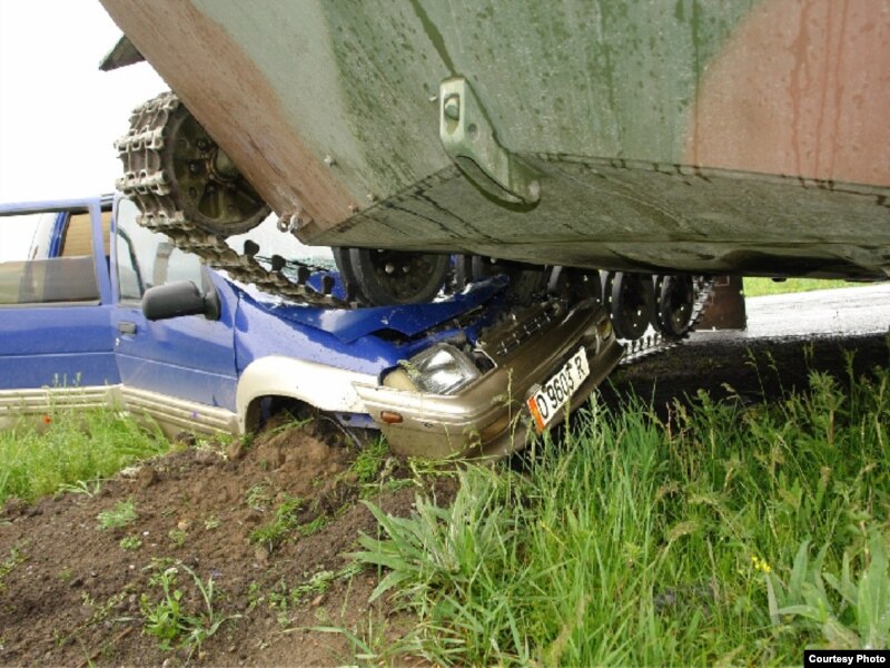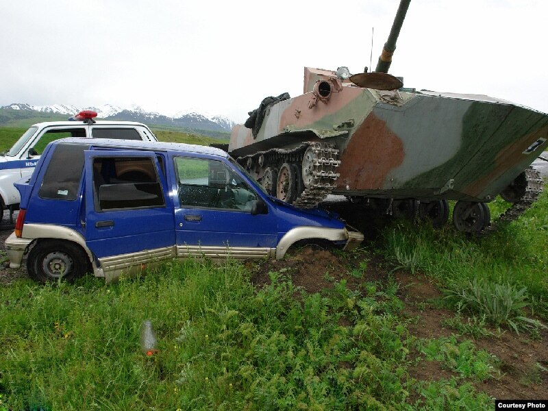 - МАИнин автоунаасын көрүп, жолдун четине чыктым. Карасам аскер техникаларын күзөтүп келаткан экен, обочого чыгып, унаамды өчүрдүм да күтүп турдум. Бир маалда биздин тушубузга келген бир БМД (боевая машина десанта) жолдон сүрүлүп чыгып, түз эле менин унаамды көздөй жөнөдү. Анан көз ачып-жумганча эле унаамдын алды жагын тебелеп, үстүнө чыгып кетти. Башыма катуу сокку болуп, бутумдан жеңил жаракат алдым. Колдорум да кесилип кетти. Ошол замат унаадан атып чыгып, эки жаш баласы менен артта отурган жүргүнчү келинди көтөрүп алып чыктым. Коркконунан ал эс-учун жоготуп коюптур. Суу чачып атып араң эсине келтирдик. Ошондон жарым саат өтүп, Кадамжай райондук милициясынан, аскер прокуратурасынан кишилер келип, ишти териштире баштады. Жүргүнчү келинди “Тез жардам” алып кетти. Унаам болсо оңдогонго жараксыз болуп калды.