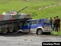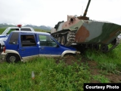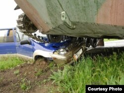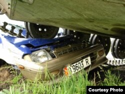 Өзбек танкынын астында калган А. Абдураимовдун унаасы. 2-июнь, Баткен.