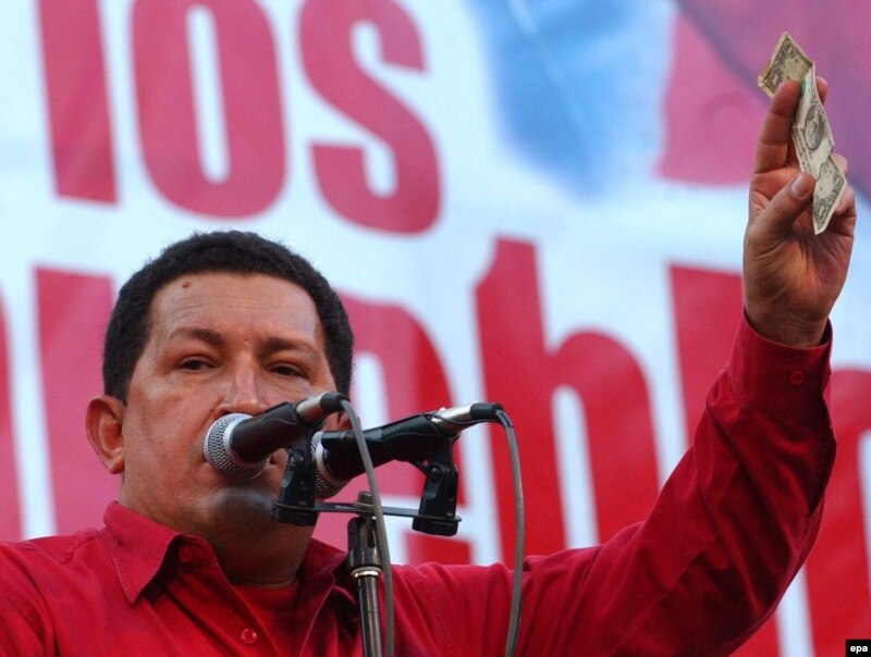 Венесуэла президенти Хуго Чавес АКШнын 1 долларын көрсөтүүдө. Каракас. 23-январь 2005