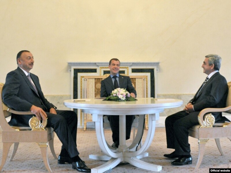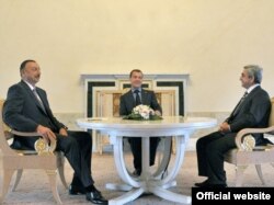 Азербайжан президенти Илхам Алиев (солдо), Россия президенти Дмитрий Медведев (ортодо) жана Армения президенти Серж Саркисян (оңдо) Санкт-Петербургдагы экономикалык форумдан тыш убактагы кездешүүдө. 17-июнь 2010