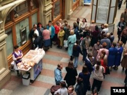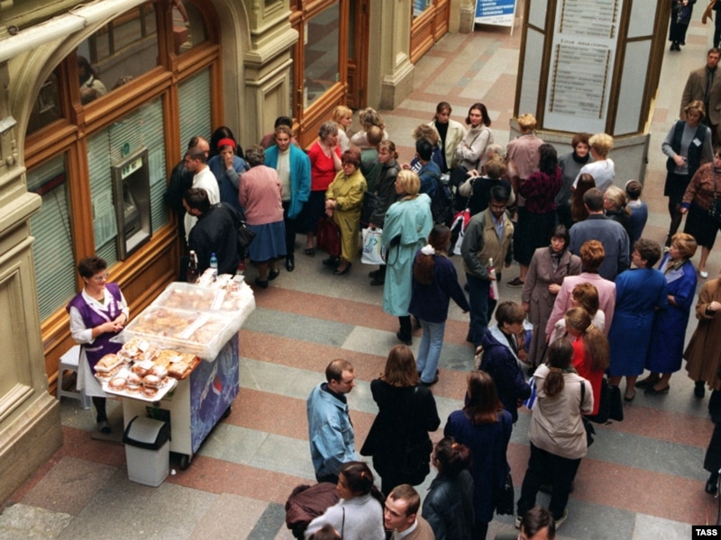 Москванын атактуу соода борбору-ГУМдагы банкоматтан акча алганы кезек күтүп турган адамдар. 23-сентябрь 2009