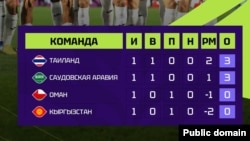 Ошол эле күнү катарлаш беттеште Сауд Арабиясы Оман курамасын 2:1 эсеби менен уткан. Учурда тайпада Сауд Арабия менен Тайланд үчтөн упайы менен биринчи, экинчи орундарды ээлеп турушат.