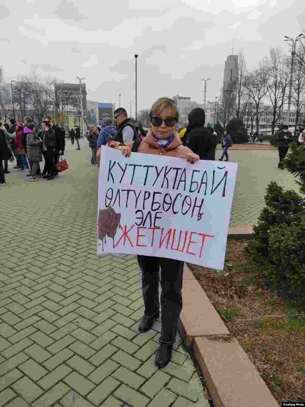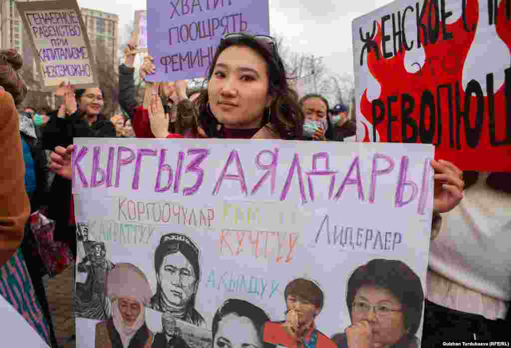 Бишкекте 8-мартта «Аялдардын тилектештик маршы» өттү. Ондогон адамдар парламент имаратынын алдына чогулуп, Чүй көчөсүн бойлоп Абдрахмнов көчөсүнүн кесилишиндеги Уркуя Салиеванын эстелигине чейин жөө барышты. Жүрүштө аялдардын укуктарына байланыштуу ураандар айтылды. Аны ырчы Зере жетектеп чыкты.