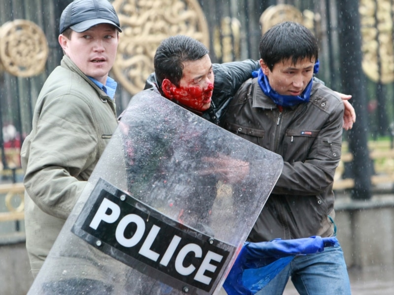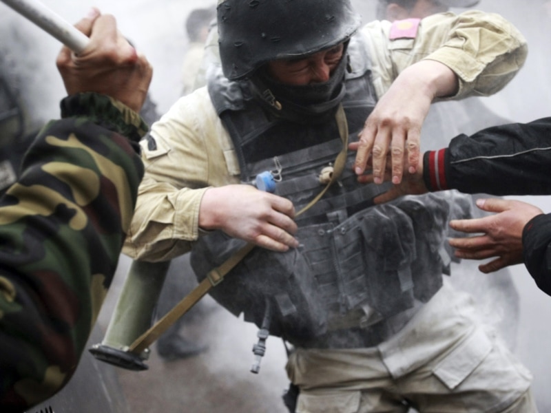 Милицияларды топ-топ болуп сабай башташты. Бирөөсүн беш-алтоо биригип алып тепселеп, жанчып салышты. Милиция кызматкерлери дубалдан ашып түшүп, формаларын чечип, ыргытып аткан эпизоддорду карап отуруу өтө оор болду... Баарынын ичинде граждандык кийими бар экен, Кудай жалгап, байкалбай, элдин катарына кошулуп алышты.
