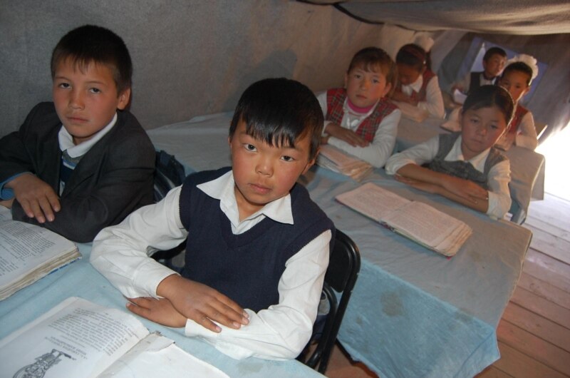 Кара-Суунун Папан айыл округундагы Айбаш Семетеев мектебинин окуучулары чатырда билим алышууда. Алардын мектеби эки жыл мурда өрттөнүп кеткен.