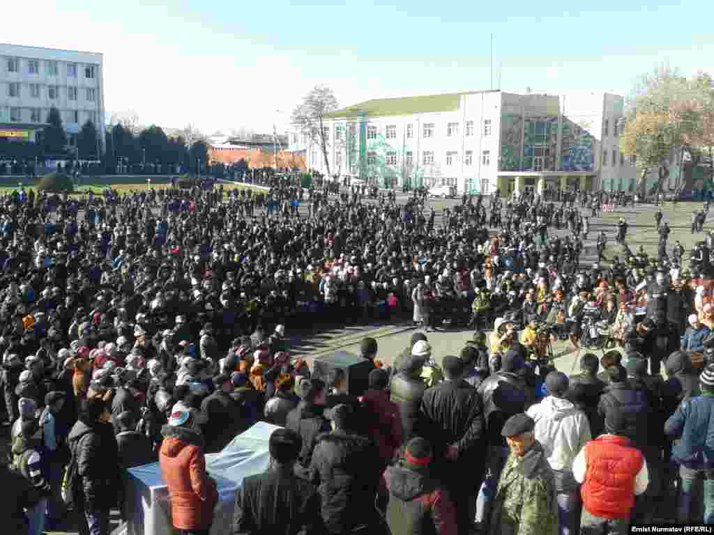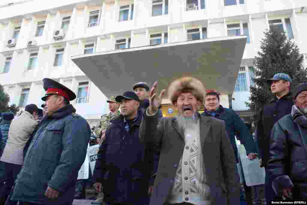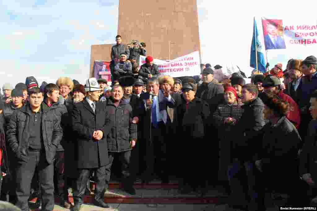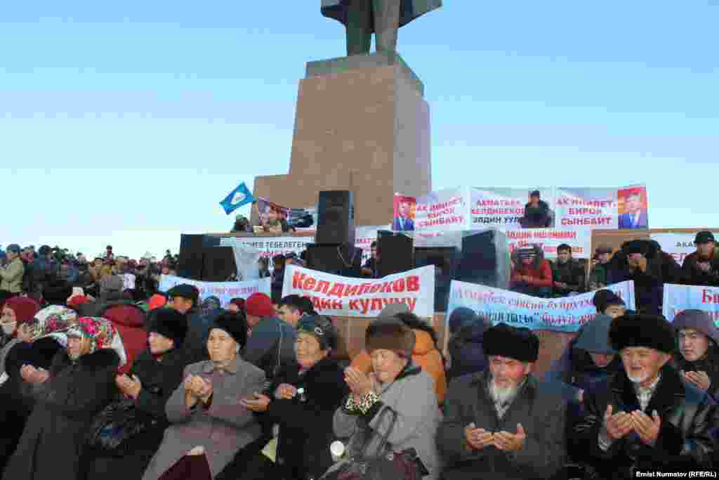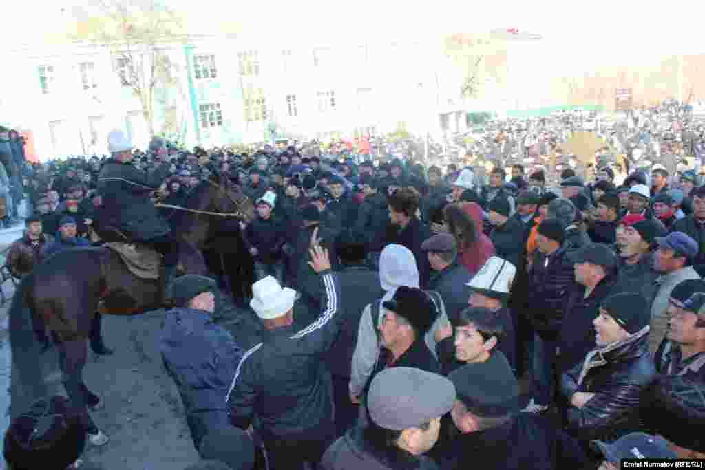 Эки айга камалган депутат Акматбек Келдибековдун тарапкерлери Ош шаарынын борбордук аянтында митинг өткөрүп жатат. Депутатты бошотуу талабы менен чыккандардын арасында атчандар да бар. 2-декабрь, 2013