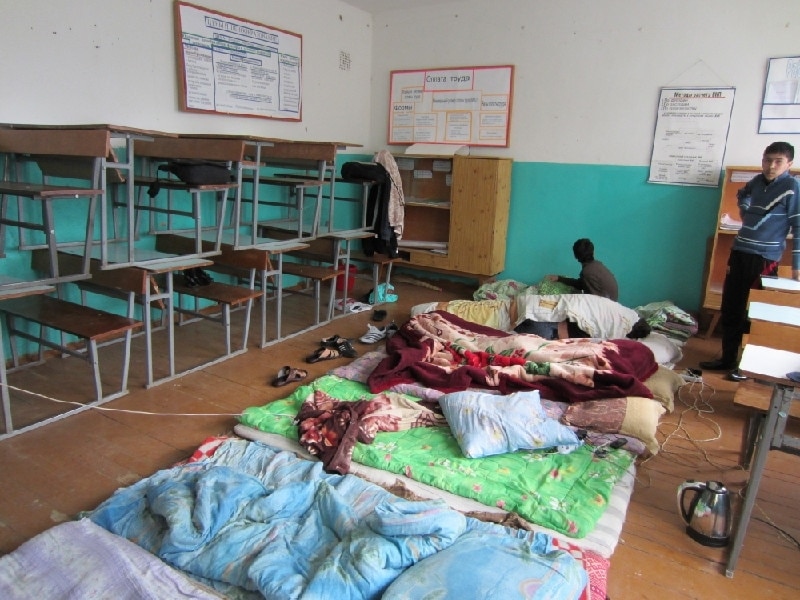 - Сентярбда баламды узатып келгенче ушул жакта калып калдым. Биринчи күнү спорт залда түнөдүк, аябай суук болгондуктан ал жактан класстык бөлмөлөргө көчтүк.