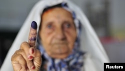 Ливиялык аял шайлооканада добуш бергенден кийин. Триполи,  7-июль, 2012