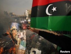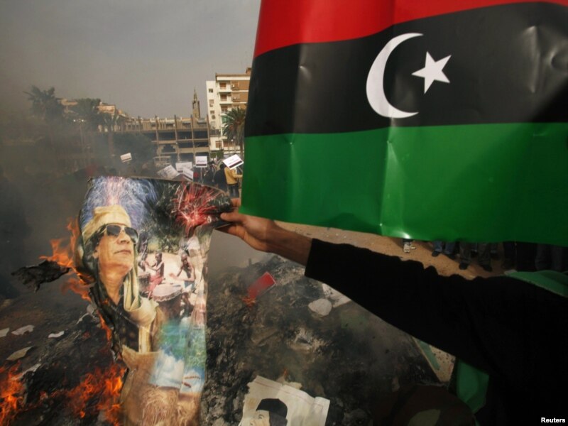 Козголоңчулар Каддафинин сүрөттөрүн жана ал жазган "Жашыл китептин" нускаларын өрттөшүүдө. Бенгази, 2-март 2011