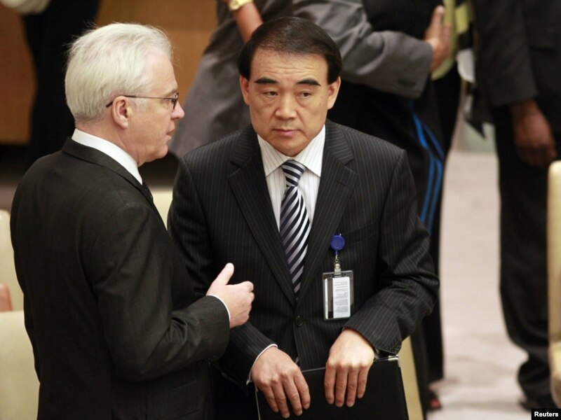 Орусиянын БУУдагы элчиси Виталий Чукин (солдо) жана Кытайдын БУУдагы элчиси Ли Баодун (оңдо) Коопсуздук кеңешинин кезектеги жыйыны алдында. Нью-Йорк, 9-июнь, 2010